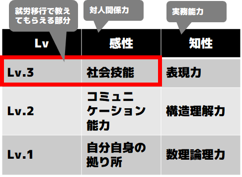 残念ながら実際の就労移行支援で教えている内容は上記の表ではLv.3の「感性」の内容のみである。だから就労移行支援の訓練を受け身で受けているだけでは成果はでない。理由は簡単で、基礎ができていないからである。それ以外の領域については自学自習が必要である。だから能動性と正しい方法が必要不可欠である。
