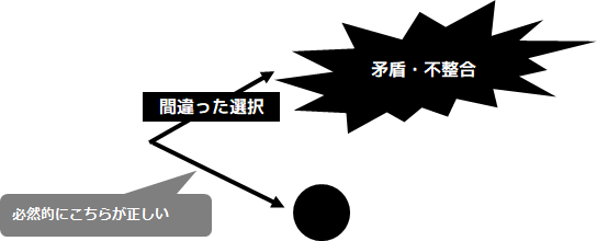 ちなみに上記論理で命題の正当性を示すことを背理法と呼ぶ。背理法とはあえて間違った論理展開をし、それで問題が起きることによって、あえて間違った選択は間違いであり、そうでない選択が正しいことを示す。図で書くと以下のようになる。