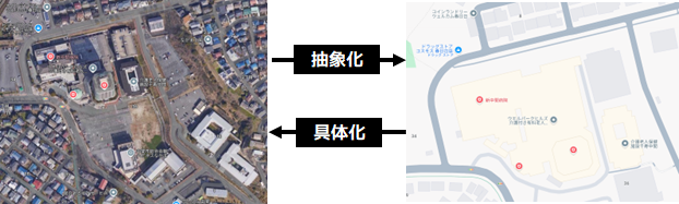 地図は、位置を知ることが目的である。その目的を果たすために、写真では事細かく色なり形状なりがあるが、それらを全部カットして、位置さえわかればいいレベルまで簡略化する。これがモデル化である。
